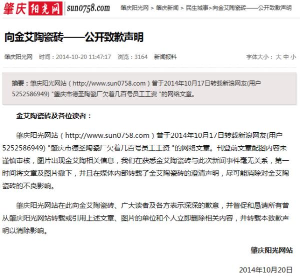 肇慶陽(yáng)光網(wǎng)向金艾陶瓷磚——公開致歉聲明