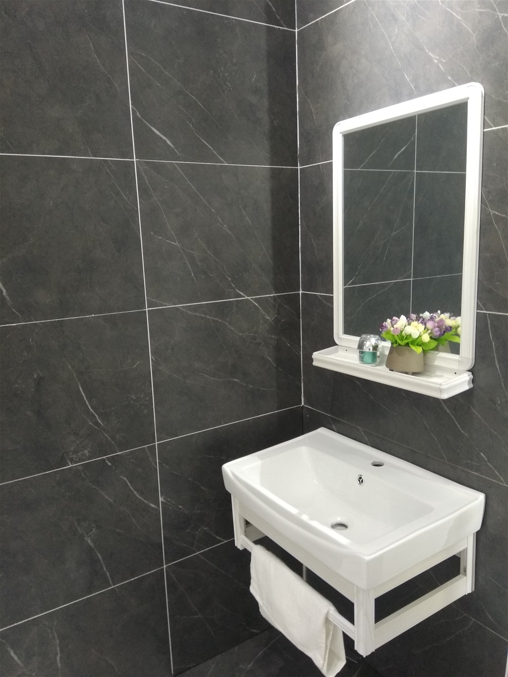 這是緞光釉鋪貼的衛生間模擬間,衛生間講究私密性,設計師一般考慮使用深色磚,緞光釉防滑度高,非常適合廚衛、陽臺地磚墻磚使用。