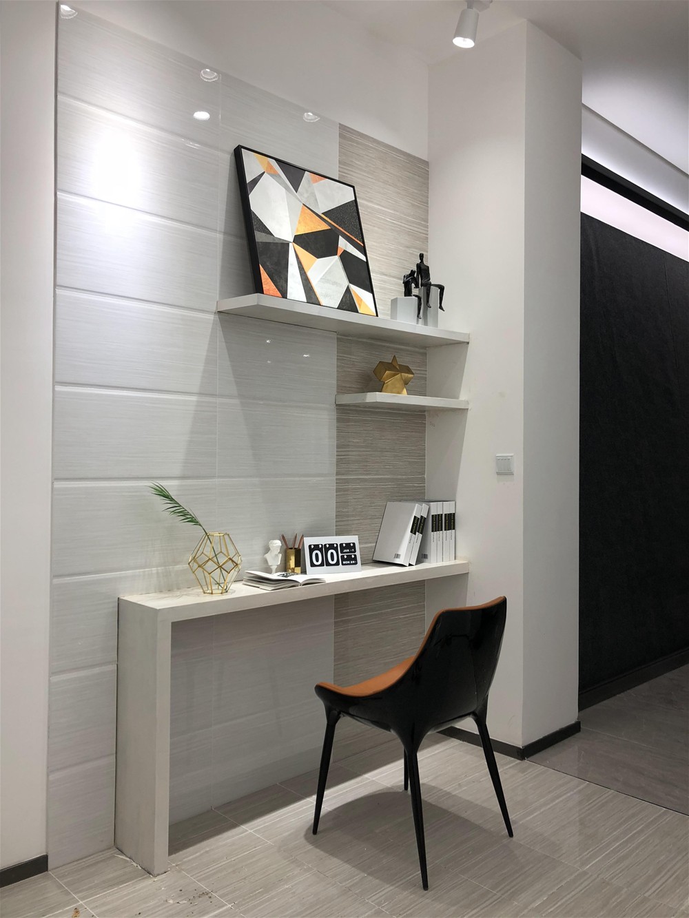 這是由噴墨瓷片鋪貼的書房墻面,亮面磚易于打理,磚面線條簡潔舒適。