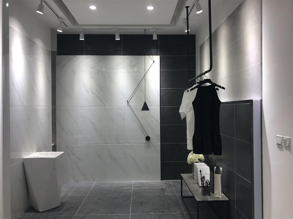 這是吧臺模擬間,由九面通體大理石和緞光釉不同規格、產品、顏色鋪貼的墻面,個性、時尚,搭配大理石吧臺和金屬軟裝,營造出輕奢的質感。