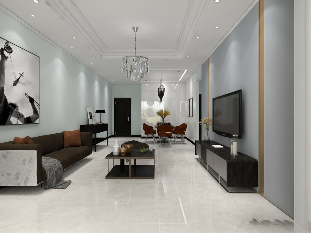 客廳以黑白灰為主色調(diào),整個空間以簡潔明朗的線條組合,電視背景墻用金色材質(zhì)點綴,地磚鋪貼潘多拉灰艾釉石,提亮了整個空間。