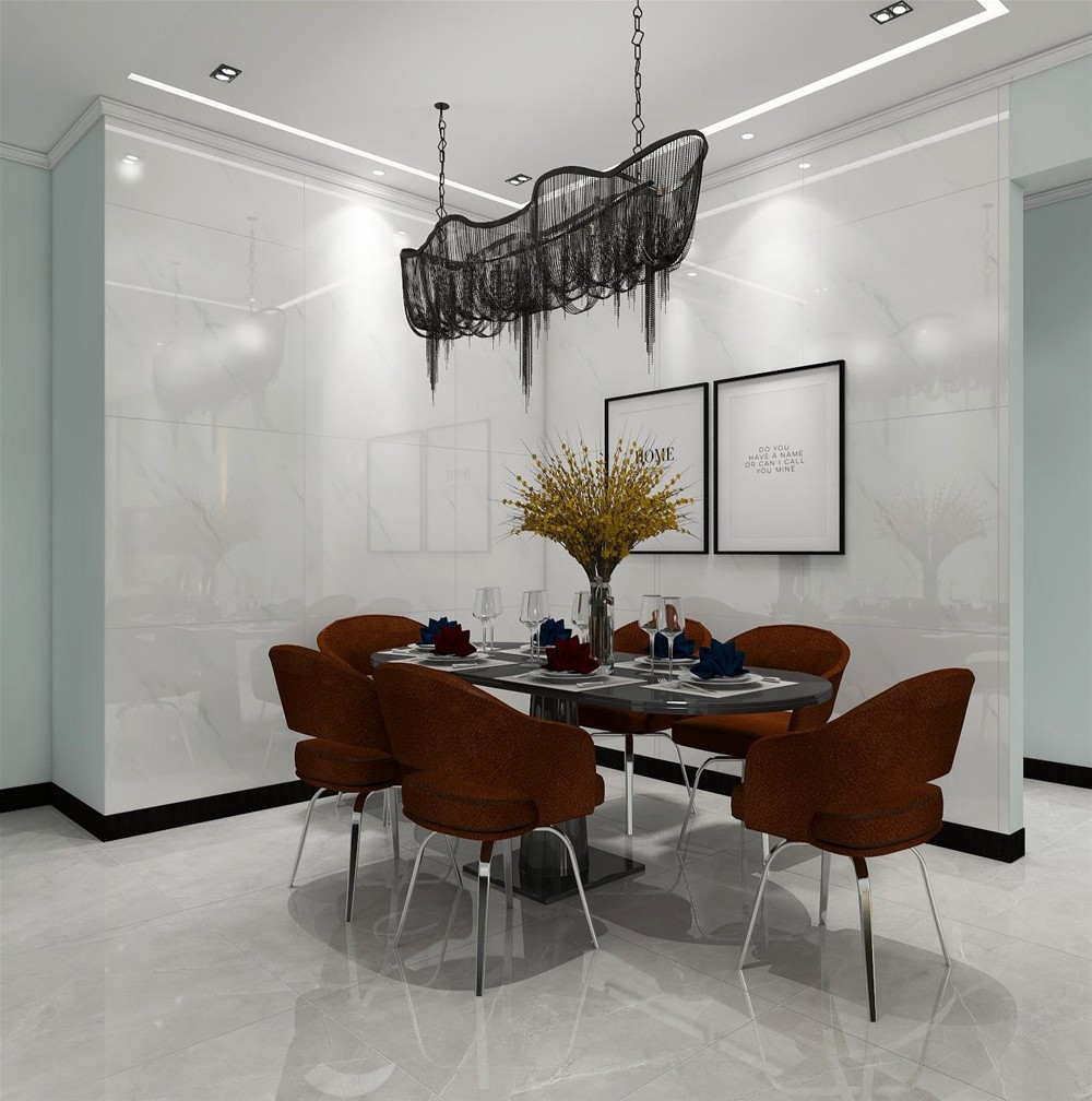 餐廳的色彩和質(zhì)地是整個大空間的美好衍生,餐椅的布藝軟包沿用了高調(diào)的橙色,搭配爵士白餐廳背景墻,吊燈是創(chuàng)意十足的流蘇元素,帶來了十分愜意的用餐感受。
