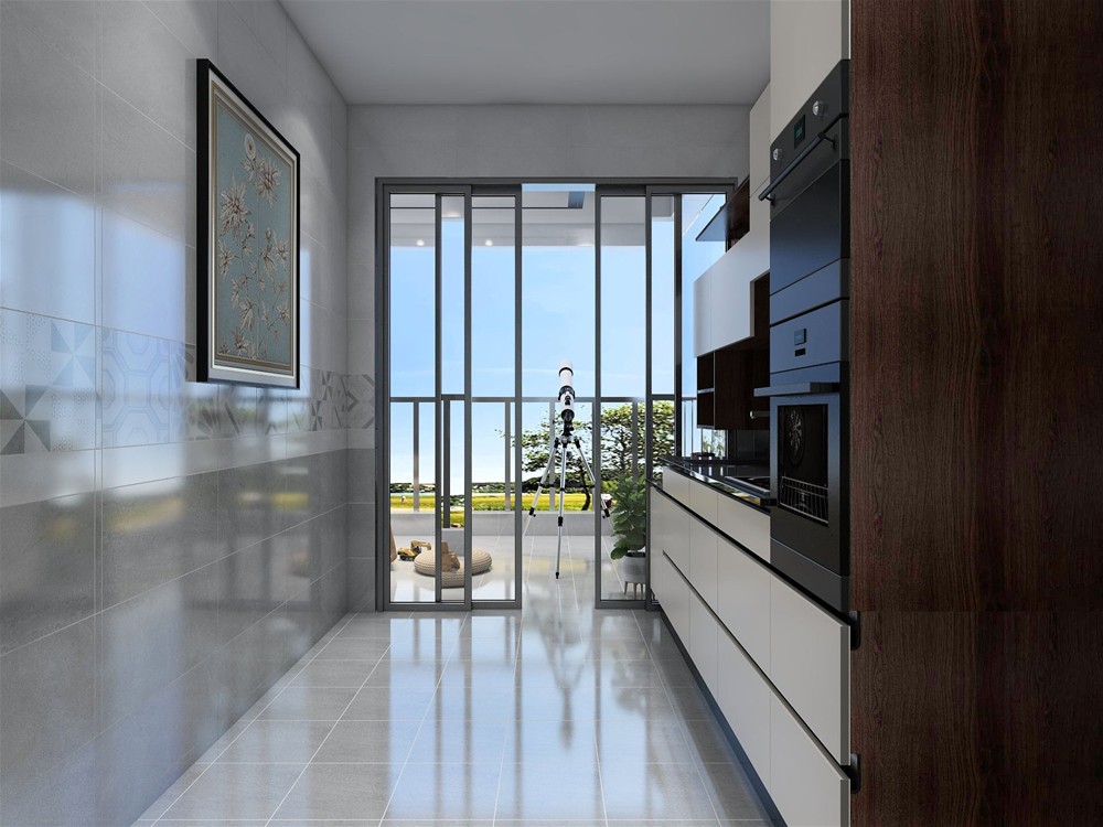 開放式廚房與陽臺相通,廚房用玻璃門相隔,陽光揮灑進來,干凈明亮的廚房會讓下廚的人擁有一個清新愉悅的舒適體驗。