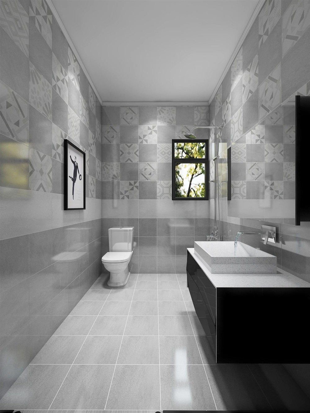 家用衛(wèi)生間講究私密性,設計師選用淺灰色的噴墨瓷片,這是一款應用范圍廣泛的產(chǎn)品,一深一淺與花片搭配使用讓空間不會過于單調(diào)。