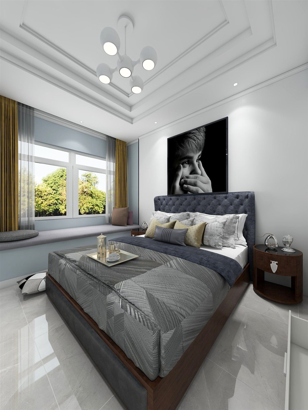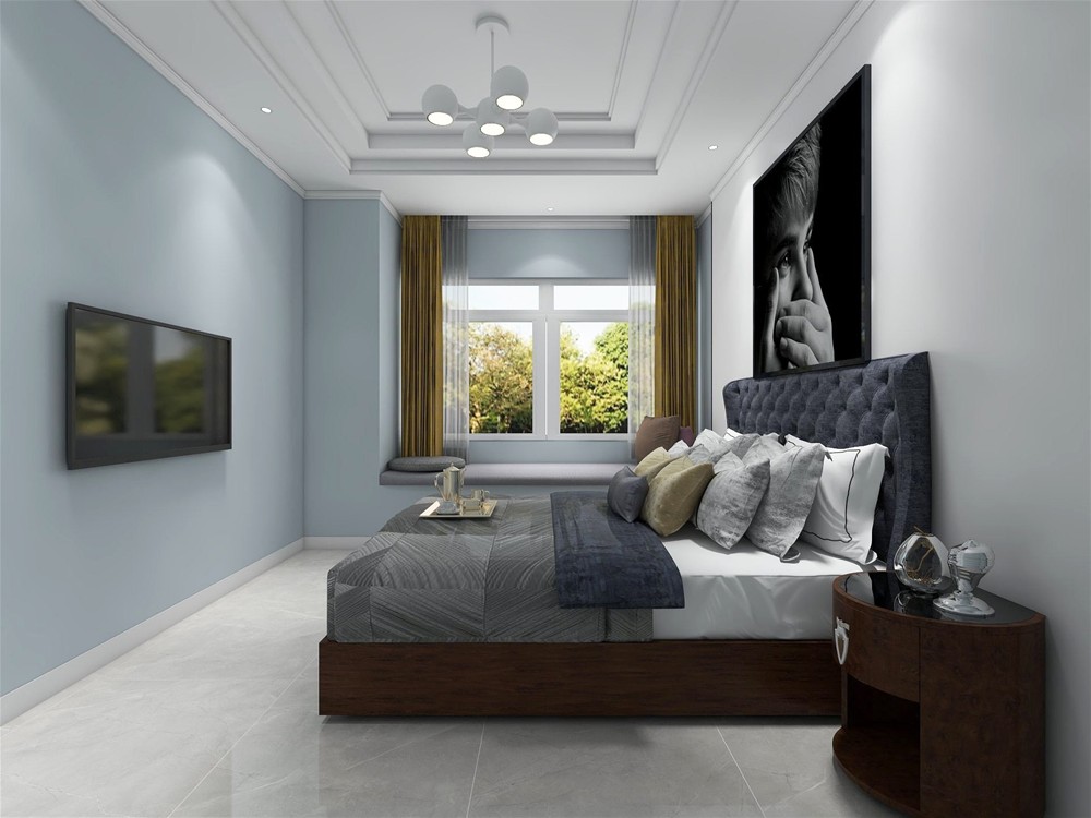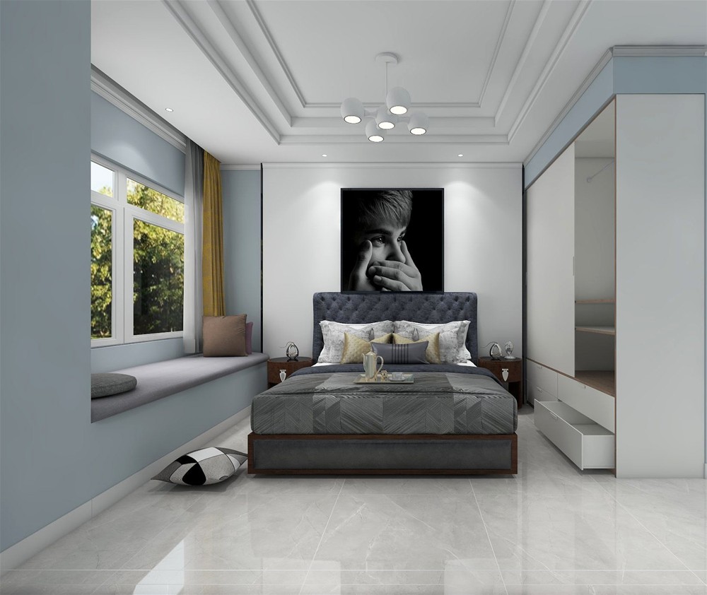 以灰色調(diào)為基調(diào),地磚選用淺灰色艾釉石,大床選用相對地磚深一點的灰色,層次分明。
