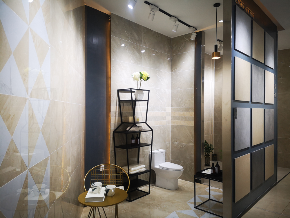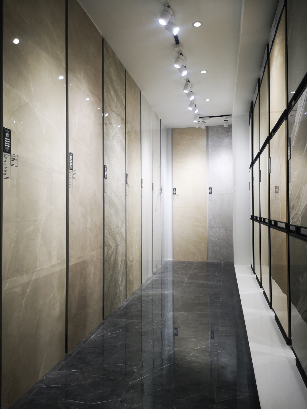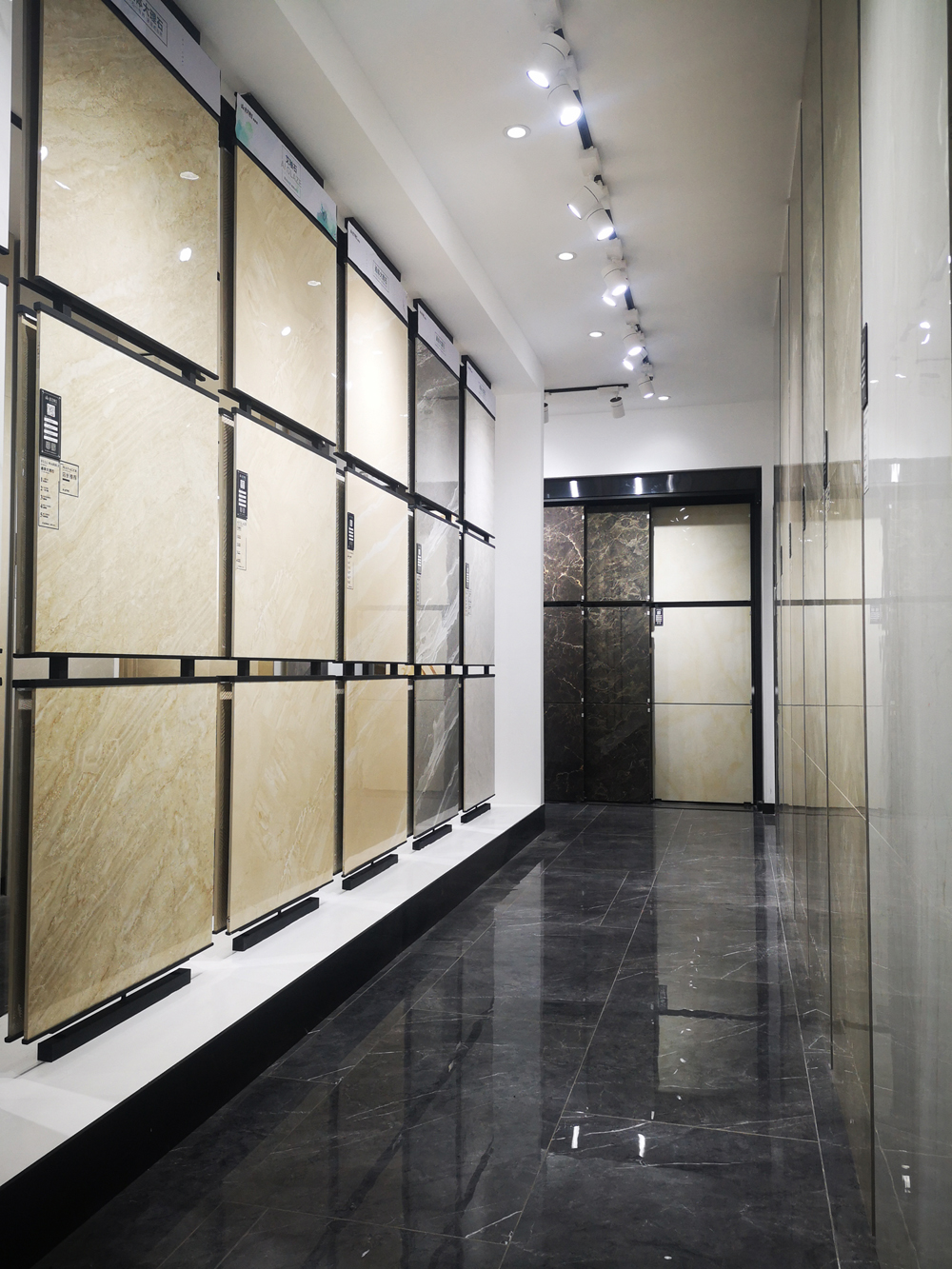 這是選材區(qū),打豎的陳列方式射燈下的產(chǎn)品,直觀、整潔、大氣、很好地凸顯產(chǎn)品的紋理,推拉陳列方式主要針對噴墨瓷片,簡單一堵墻就能把噴墨瓷片的搭配、鋪貼、風(fēng)格直觀呈現(xiàn)。
