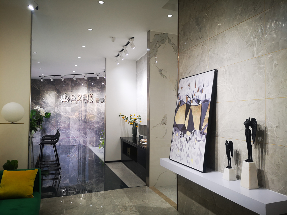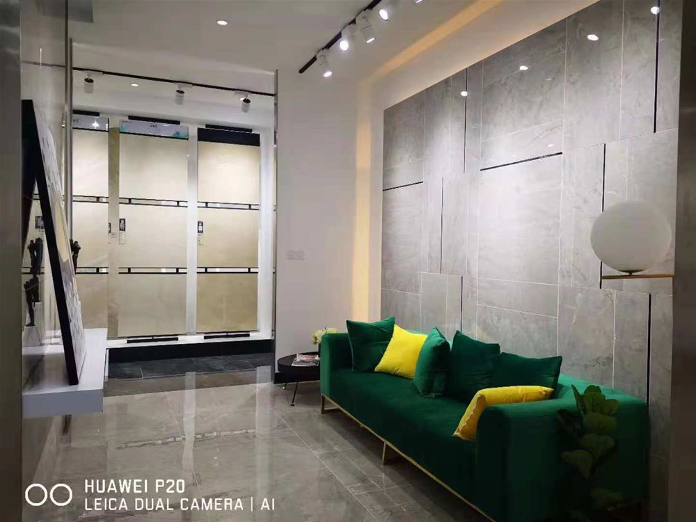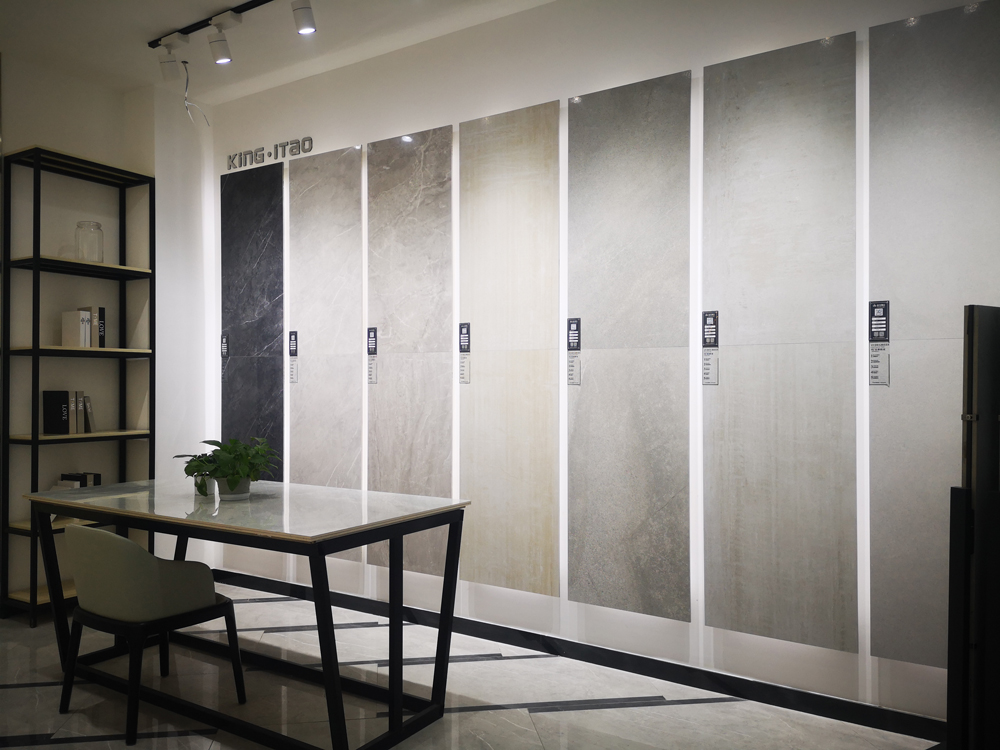 一進(jìn)門是金艾陶logo的形象墻,大規(guī)格900*1800艾釉石KYP918005直鋪而成,地巖立體的畫面感,品牌:大氣、簡潔的形象表現(xiàn)得淋漓盡致。