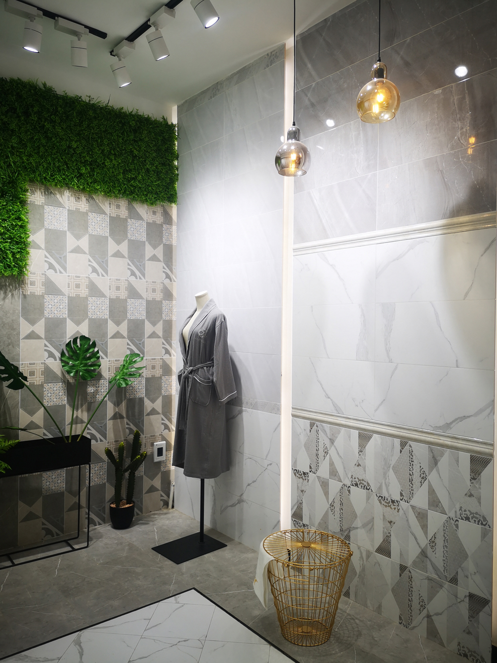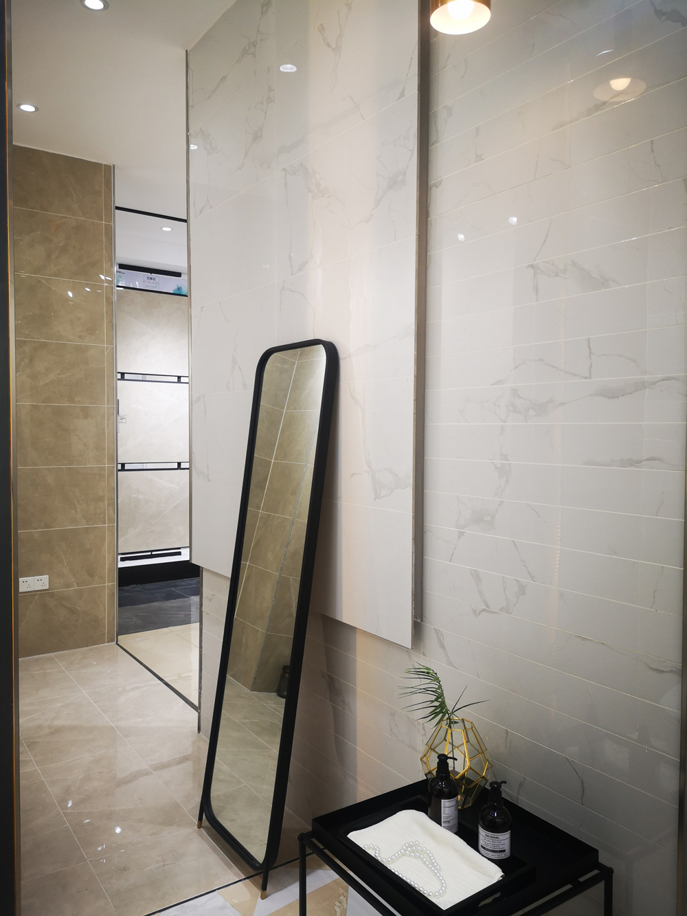 這是由新品通體大理石KTA9821鋪貼的輕奢衛(wèi)生間模擬間,白色大面積鋪貼的空間寬敞明亮,紋理大氣,一前一后營造空間的層次感。這墻面也可作電視背景墻、客廳地磚使用。