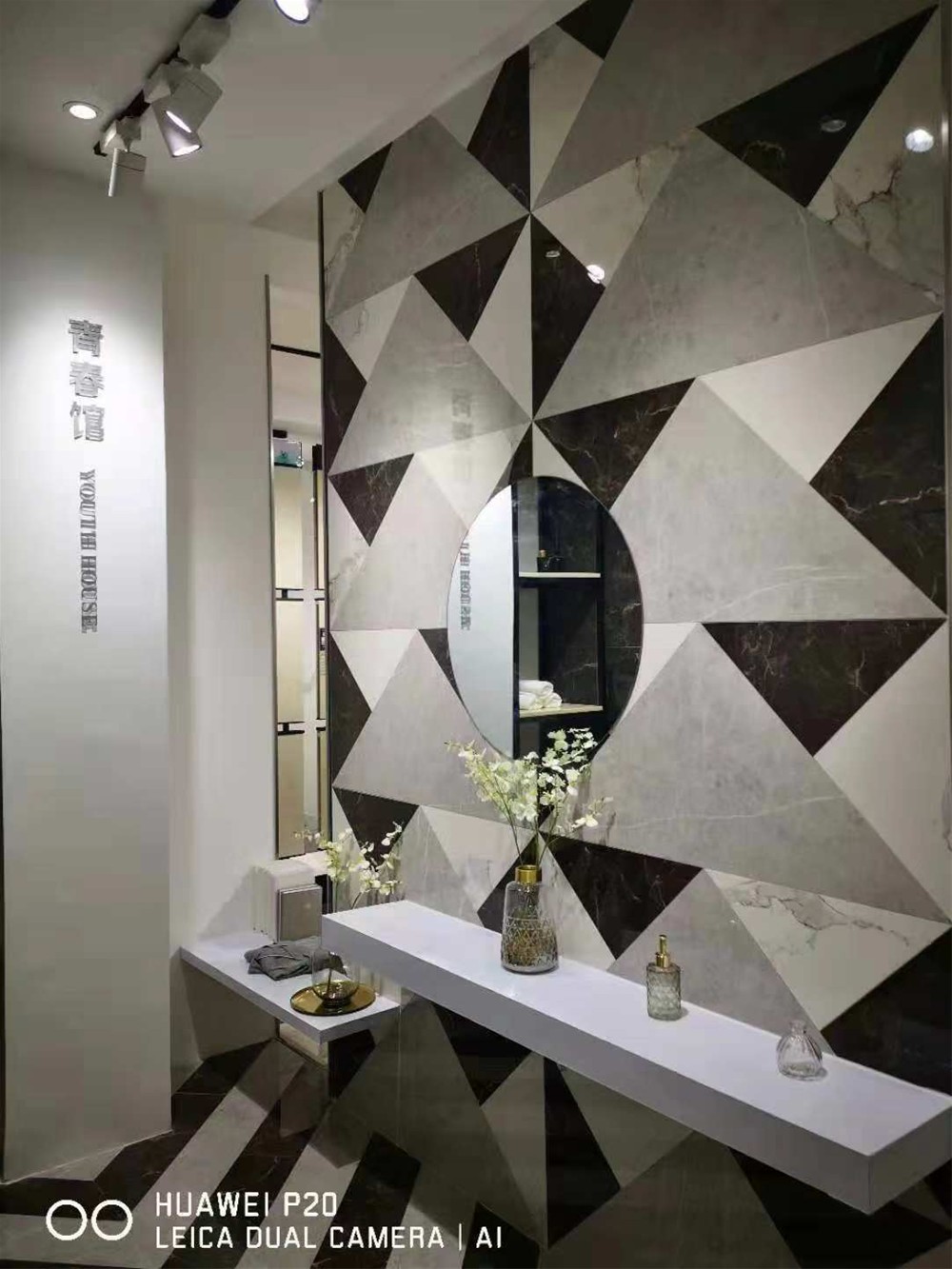 這是是由通體大理石KTA9817、KTA9818、KTA9819不同顏色不同規(guī)格三角形組合鋪貼的衛(wèi)生間,打破傳統(tǒng)的衛(wèi)生間鋪貼,搭配純白色的臺面,一繁一簡搭配不會產(chǎn)生審美疲勞。