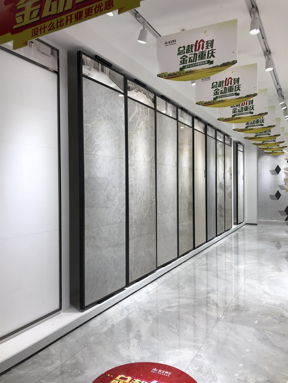 產品的展現選用打豎的陳列方式,拖拉的方式可隨意切換,占用空間少,利用射燈照射下的產品,很好地凸顯產品的紋理。