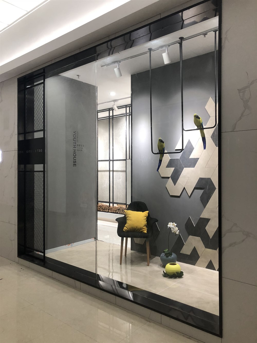 這是輕奢風(fēng)格陽臺、書房的模擬間,由噴墨瓷片鋪貼的墻面?zhèn)€性時尚,搭配金屬軟裝營造出輕奢的質(zhì)感。現(xiàn)在很多流行的咖啡廳參照這樣的設(shè)計來吸引消費者。