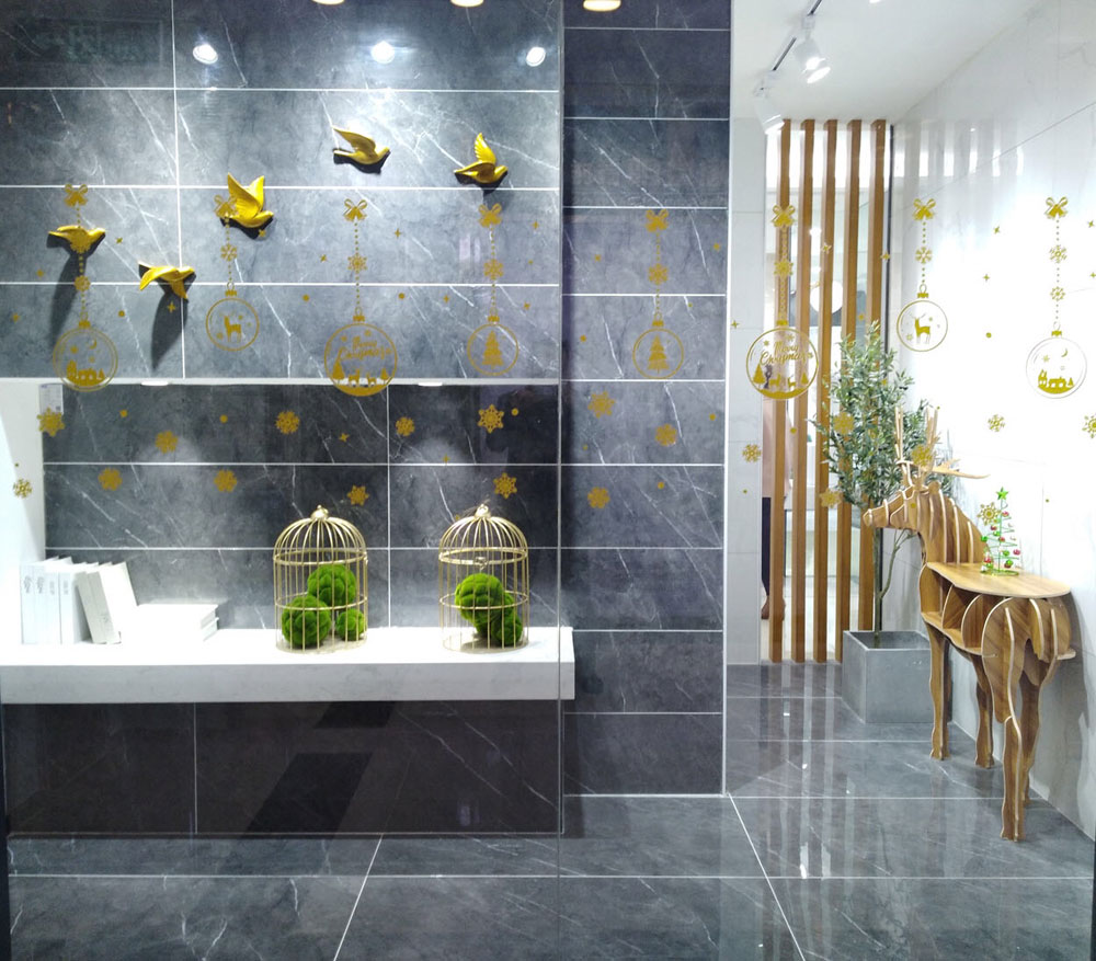 從外立面的櫥窗就能看到我們其中一個模擬間設計,這是由九面通體大理石KB9M61208卡門深灰單獨鋪貼,深灰色瓷磚搭配金色軟裝營造出神秘、沉穩、輕奢的空間氛圍,這款瓷磚鋪貼客廳地面,電視背景墻等地方同樣適合。