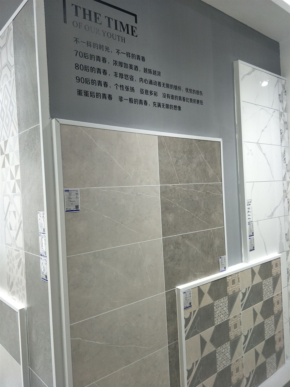 這是我們配套噴墨瓷片的展示墻,花片、小地磚、腰線、瓷片一應俱全,廚房、衛生間、陽臺等空間都適用,讓你完全省掉了搭配的麻煩。