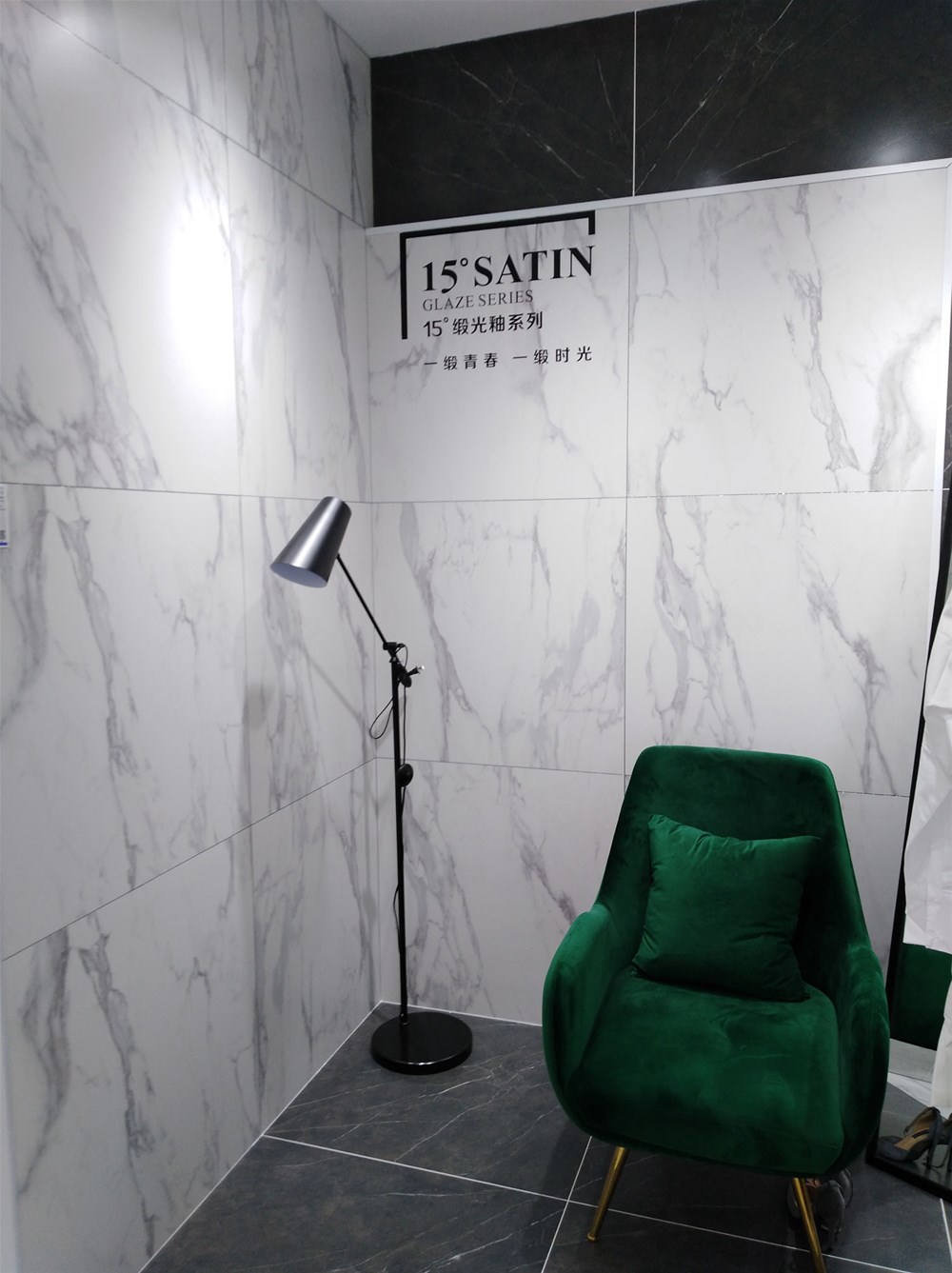 這是由15°緞光釉KFD8801卡拉卡白和KFD8808保加利亞灰搭配鋪貼的書房、陽臺或是休閑區的模擬間,一深一淺,一前一后,大紋理與小紋理的搭配,讓觀者有視覺的沖擊力,不會產生審美疲勞。