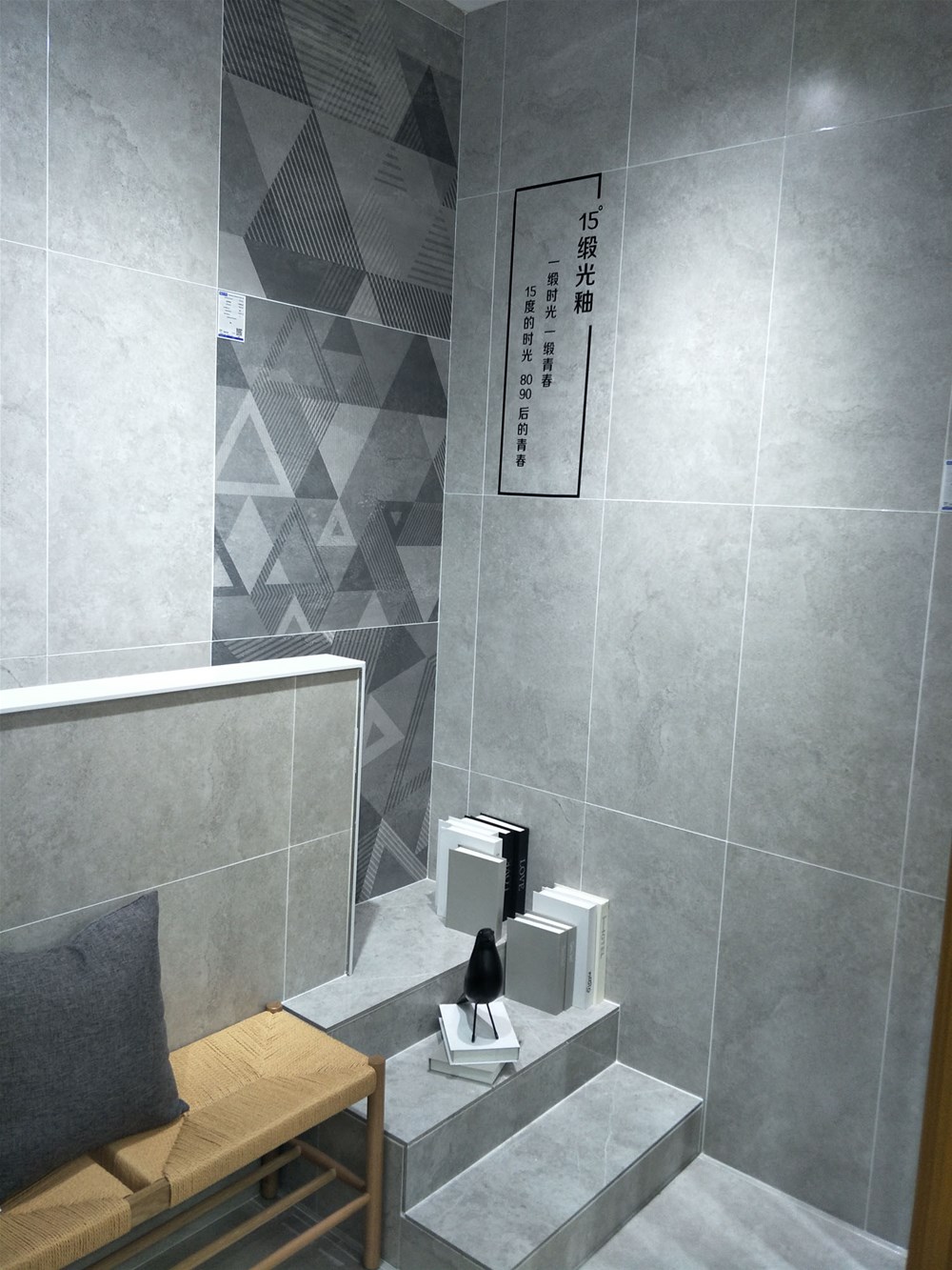 這也是15°緞光釉KFD8806銀線灰洞與KFD8806HP克洛諾斯灰搭配鋪貼的書房、休閑區。15°的護眼是我們這系列產品的亮點,看著會比亮面磚更舒適,書房用磚選緞光釉就沒錯了。