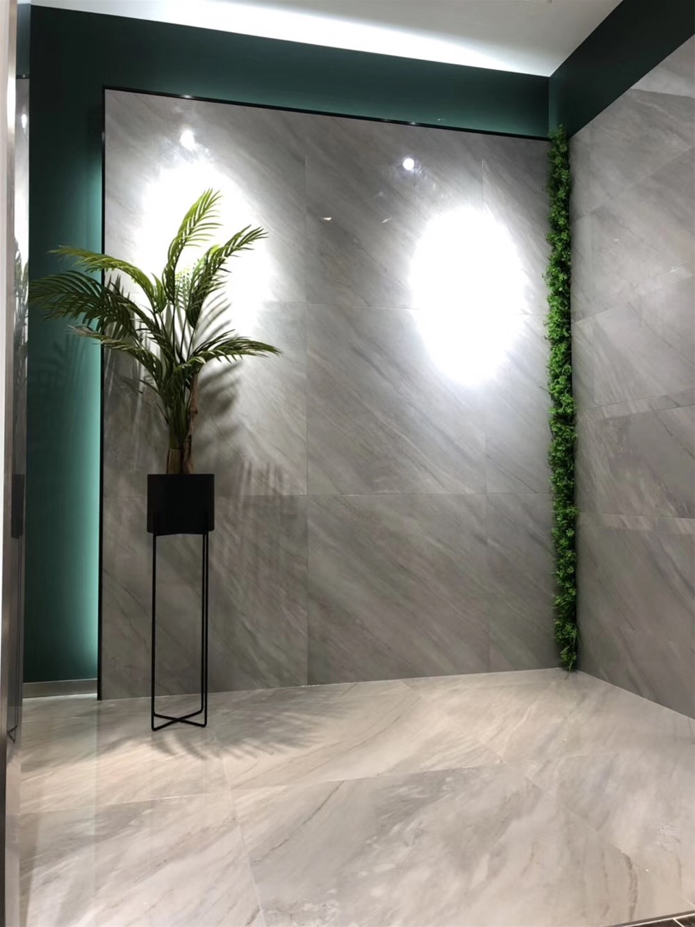 這是我們的前臺,背景墻由灰色通體大理石KA9M009羅馬布里卡通鋪,把木紋條作為空間的間隔,前臺選用白色鑲嵌銀色大理石紋,整個空間散發著簡潔優雅的氣息。凸顯簡約的品牌定位。您家地磚和背景墻同樣適合選用這款磚。