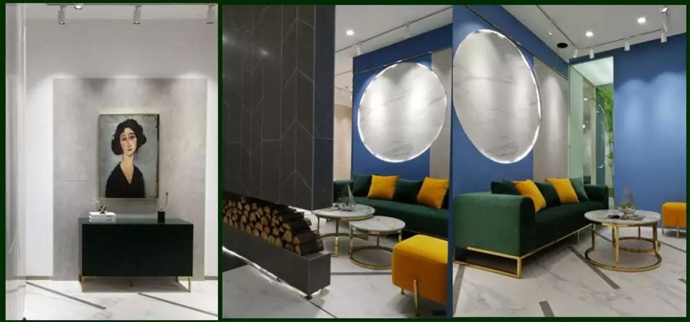 900*1800的大板以屏風的形式展現,不但很巧妙的體現了大巖板系列產品的紋理和設計感,而且通過系列的屏風展示很巧妙的把大堂區域兩邊劃分為接待區和洽談區,靜/動兩個區。