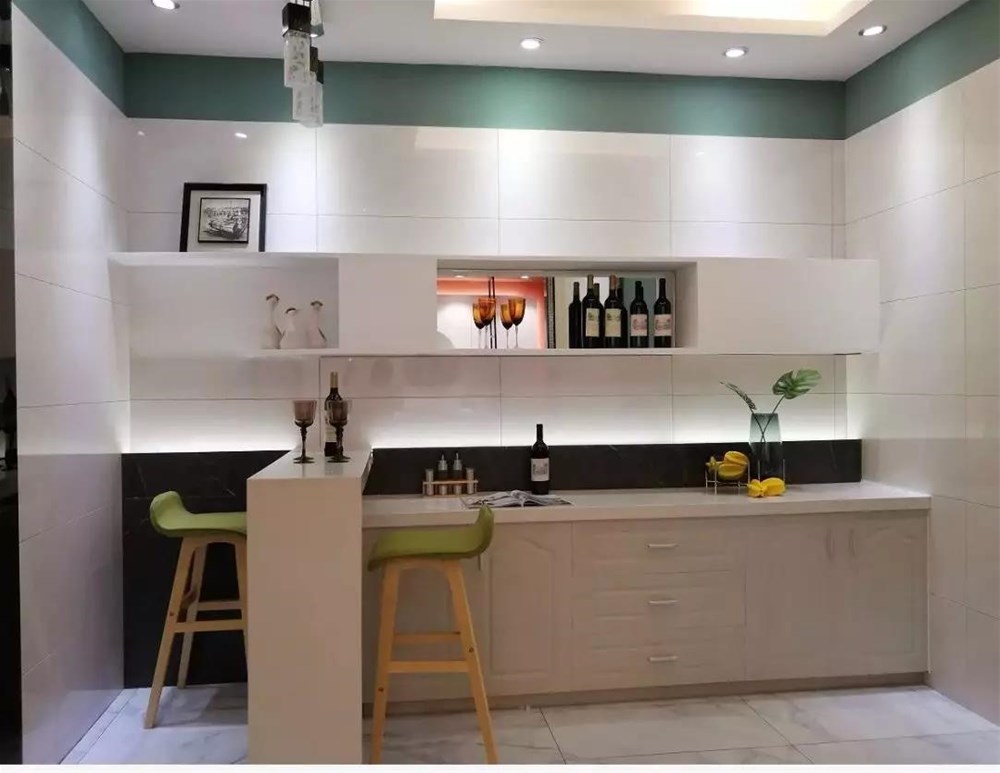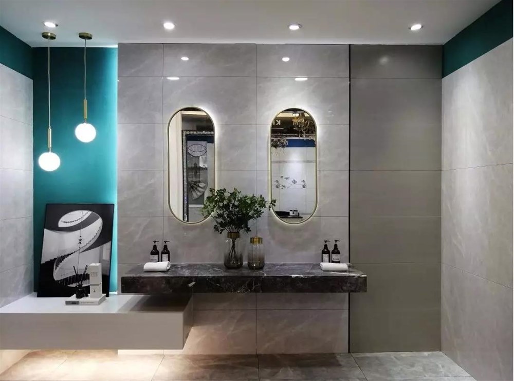 KPM48025白色飄逸的流紋作為衛(wèi)生間的墻面非常干凈素潔,400*800的規(guī)格顯得大氣美觀,相對大磚切割上墻更有性價比,高光亮面讓你的衛(wèi)生間更顯亮堂大方。洗手臺用大巖板KYP918001切割當(dāng)臺面,900*1800規(guī)格以及大理石紋理更顯檔次。