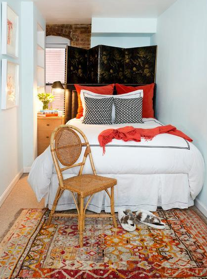 全白當然是小臥室最好的選擇,但是你也可以在謹慎的考慮過后,添加一兩種自己喜歡的色彩。如圖中,用少量的紅色和橙色,搭配做工精美的磚墻和木制家具,作為白色墻壁最好的點綴,營造輕松的居住氛圍。