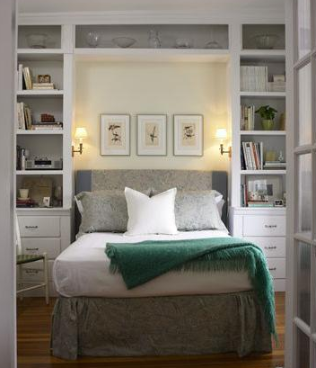 如圖的臥室設計巧妙地結合了空間來展示珍品,貨架上可以擺放書籍,抽屜在用來存放更多的個人物品的同時還充當了床頭柜。
