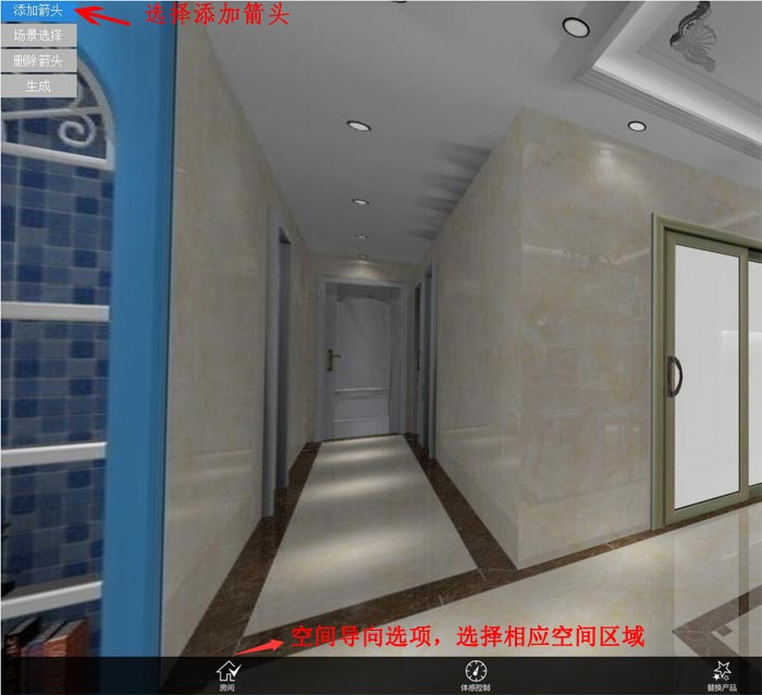 8.2、添加進(jìn)入其他房間箭頭后,進(jìn)入場(chǎng)景選擇選擇相應(yīng)的場(chǎng)景(場(chǎng)景需要跟箭頭選擇的空間保持一致)。
