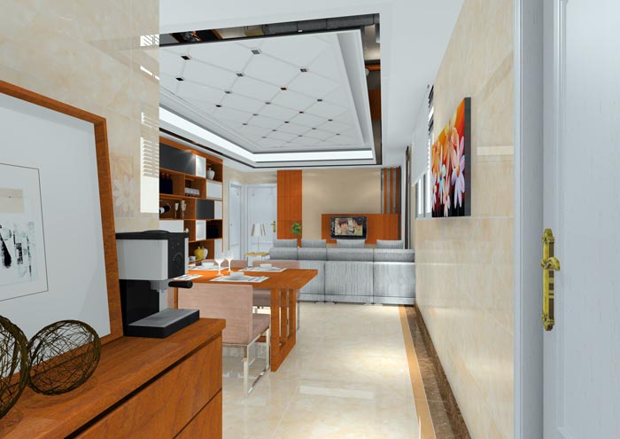 本案設計理念: 本單元是現(xiàn)代風格家居,色調(diào)以暖色調(diào)為主,體現(xiàn)溫馨的感覺,造型上以直線線條為主,沙發(fā)是簡約的布藝沙發(fā),其他的家具以板式家具為主,廚房空間與餐廳空間采用開放式通透的方式,營造出精致時尚生活空間。