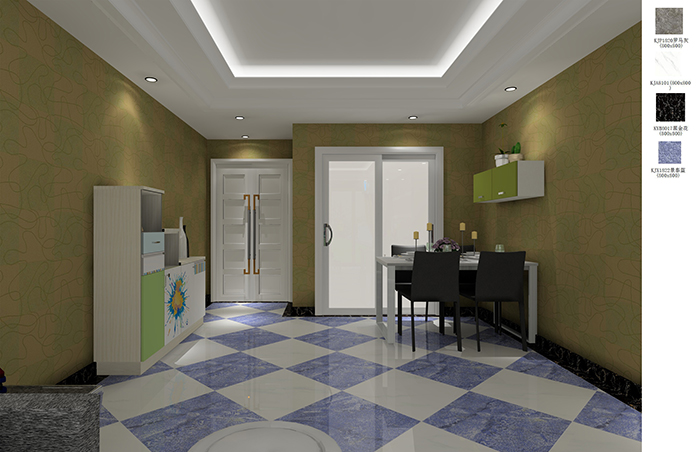 地面以藍、白色為主,給人一種小清新的感覺。在瓷磚的鋪貼方式上也蠻是新意,地面的菱形鋪貼,電視背景墻的寬、窄長條形鋪貼,讓家不在顯得單調無味。