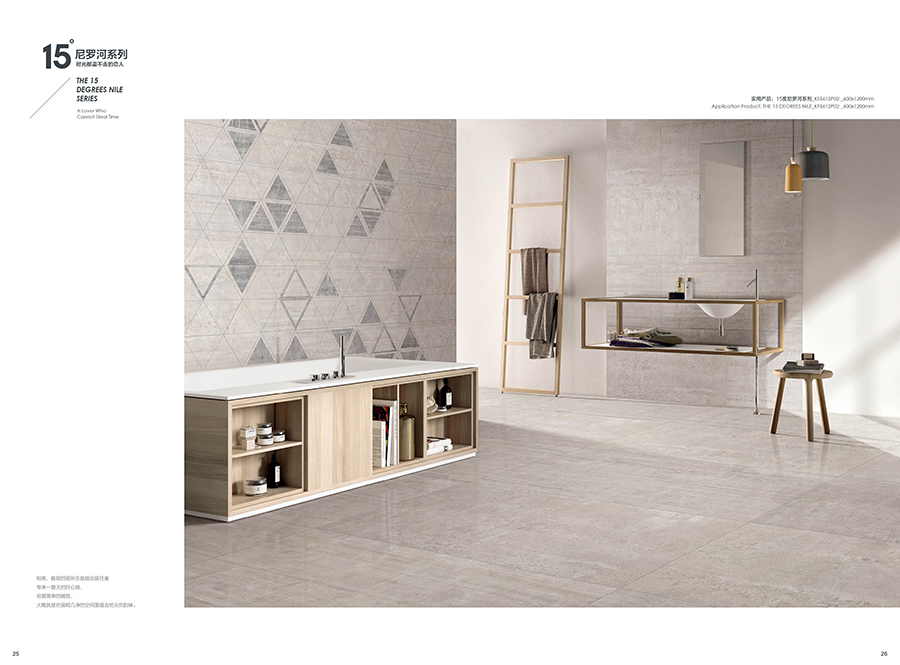 15度尼羅河,如夜幕下的尼羅河流,一路向前,偶爾也隨性地流淌,以自己的風華凝聚時代的靈魂給予世人。追溯千百年前的智慧,設計師將尼羅河的蜿蜒流長帶入產品的抽象表現中,在傳承中沉浸強烈的自然氣息,風格獨特而彰顯藝術的閑逸,傳承精髓而散發著浪漫風情,無論是大面積鋪貼,還是與其他元素混搭, 都在相得益彰中凸顯濃郁的文化韻味。