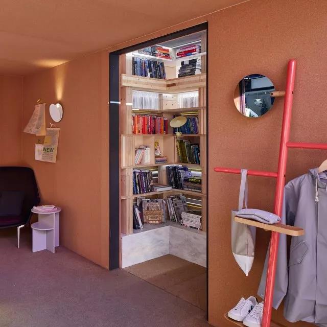根據(jù)需要將存放書本的空間設(shè)計(jì)成各式各樣的形狀也是不錯(cuò)的概念,另外紅色的餐椅讓整體看起來像在大學(xué)的圖書館里一般。