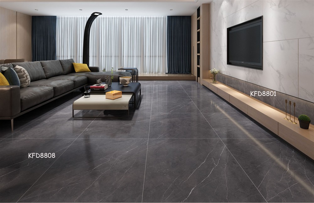 灰色調15º緞光釉鋪貼的客廳,它既不濃妝艷抹,也不輕描淡寫,緊抓80、90后消費者的審美:簡單、隨意、個性,在軟裝上,更是注重細節的表現,灰色無論與黑白搭配,還是被黃色如此明亮的顏色點綴,灰色肌理的變化都是多姿多彩,給空間無限的美感。