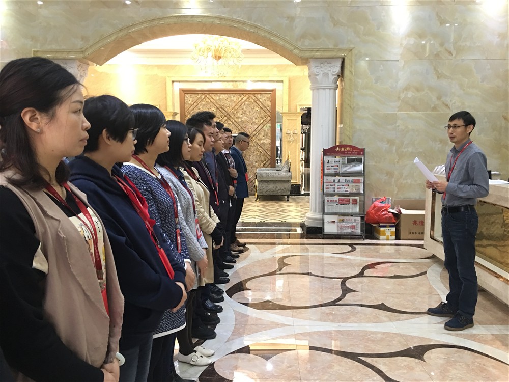 大會開始,金艾陶瓷磚市場部總監劉小良劉總先是整頓了士氣,金艾陶人個個精神抖擻,口號嘹亮,接著對4月19號春季陶博會期間工作作了整體部署和方向指引。