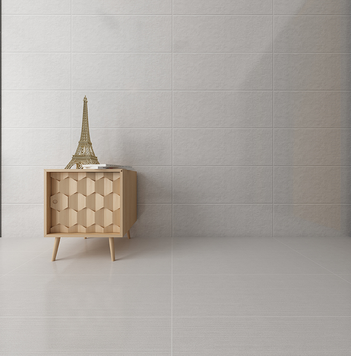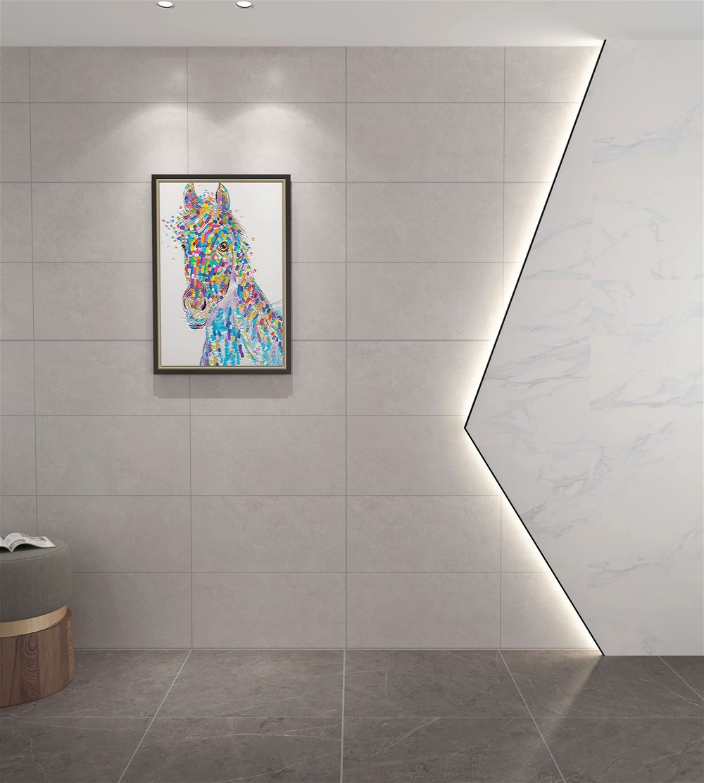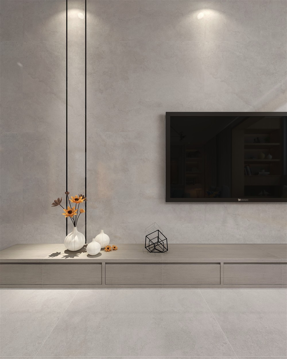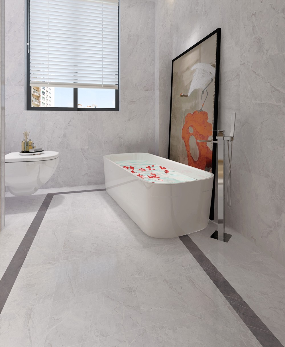 白色的表面素雅而寧靜,灰色線條橫跨其中,自然而純粹,色澤素凈大方,光感柔和自然,似乎是將一層薄薄的絲綢印刻在瓷磚的表面,縷縷輕絲纏繞,觸感舒適細膩,帶來如綢緞般絲滑體驗。