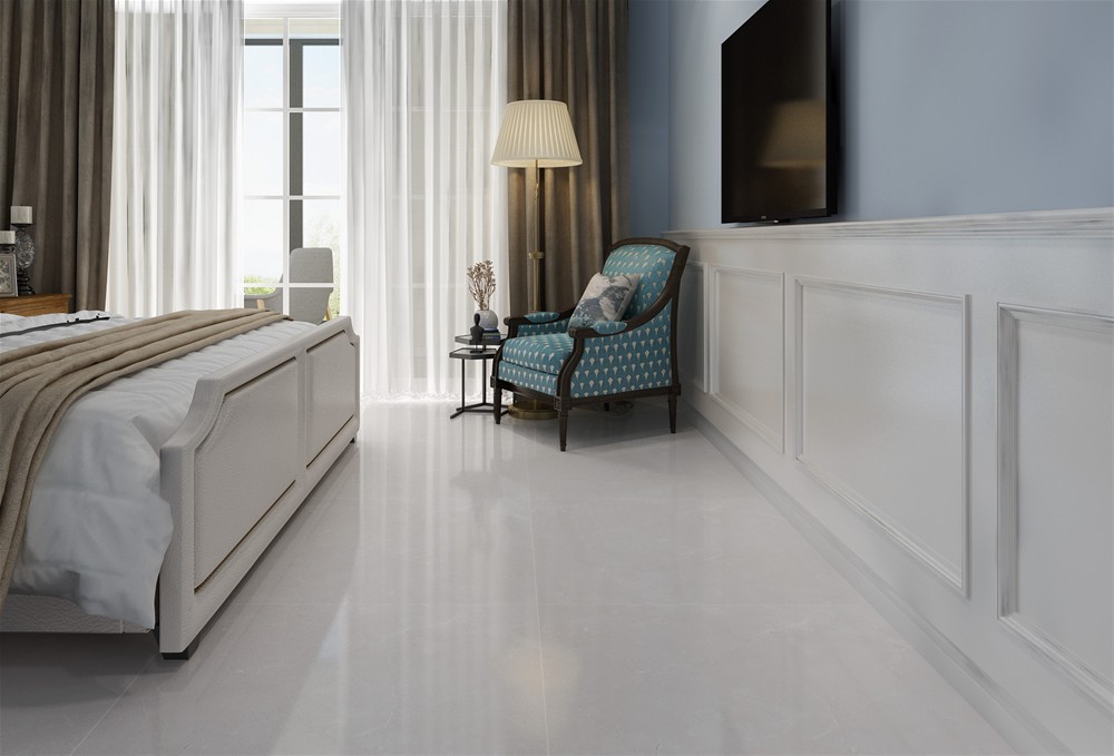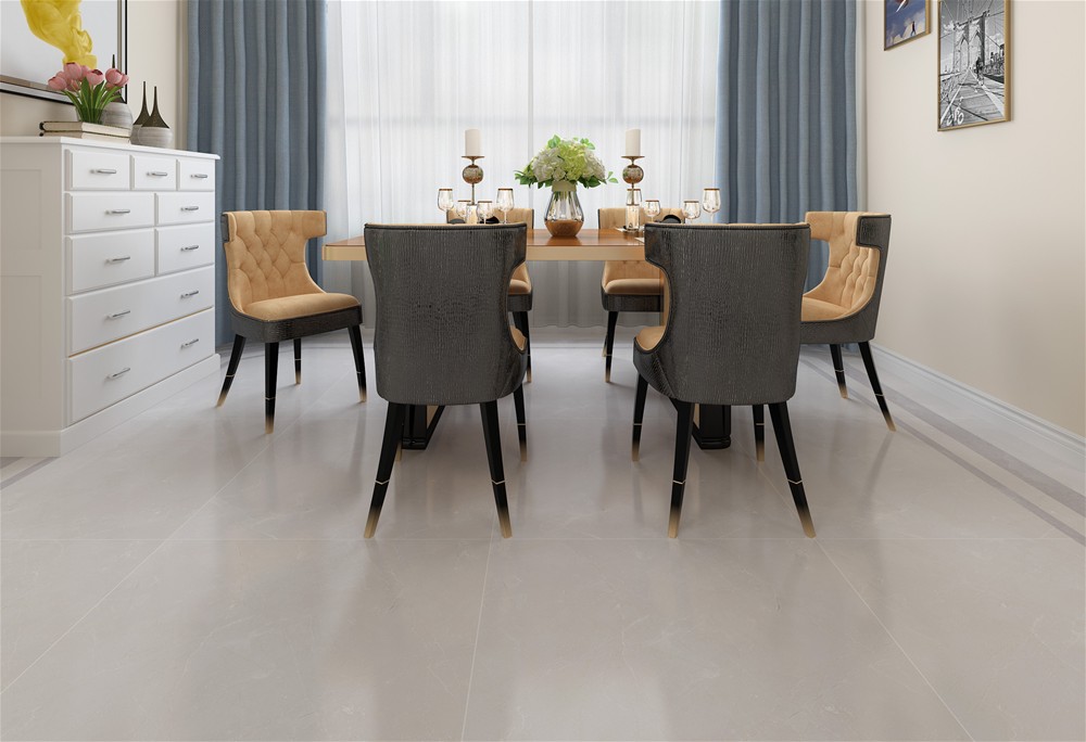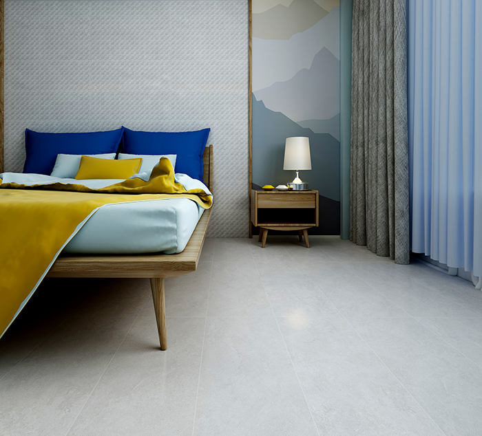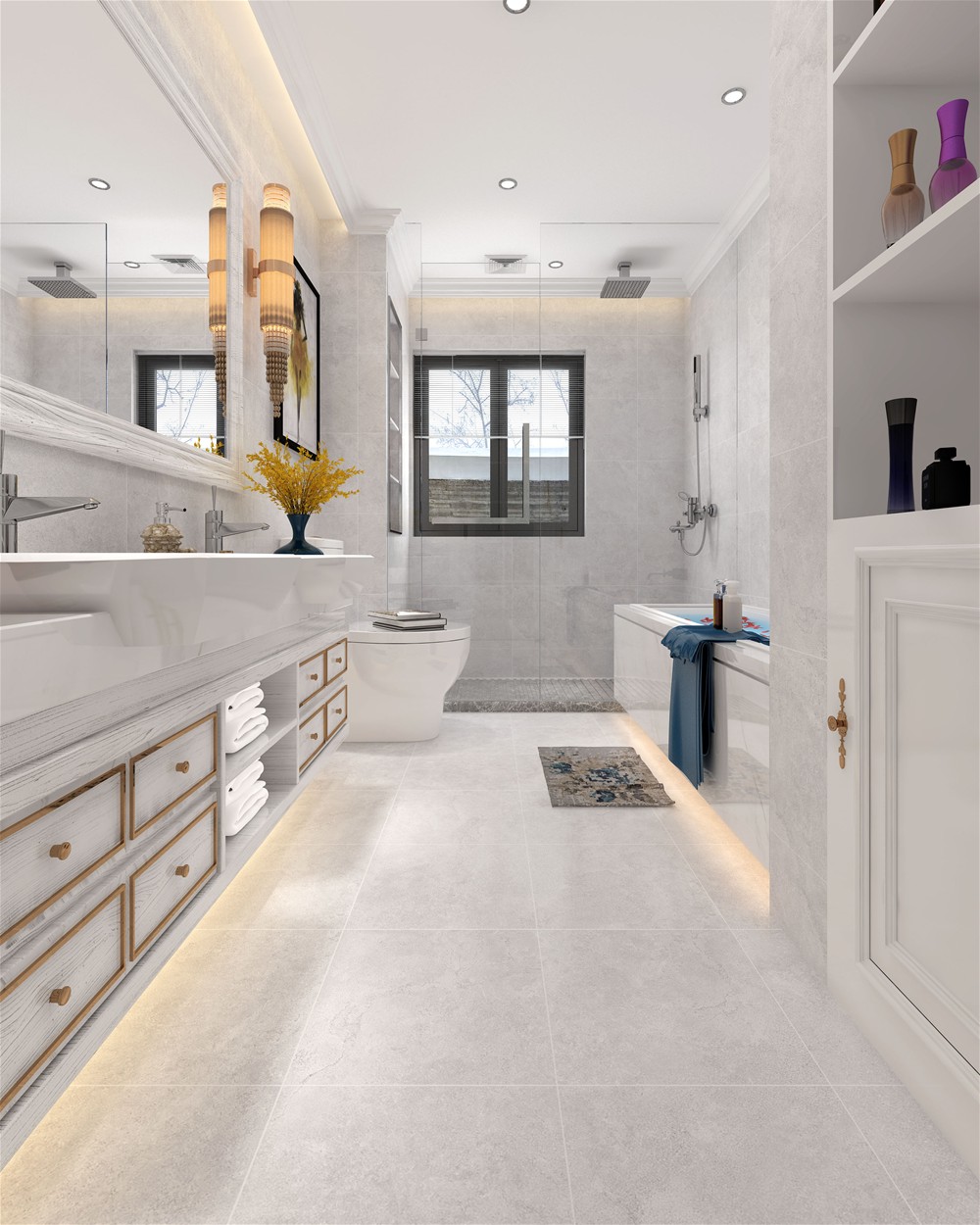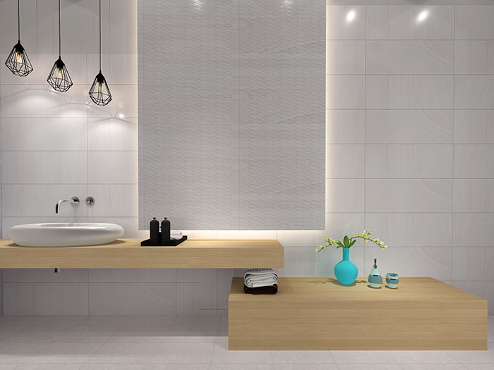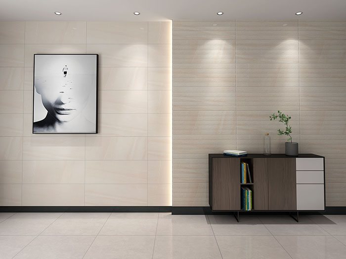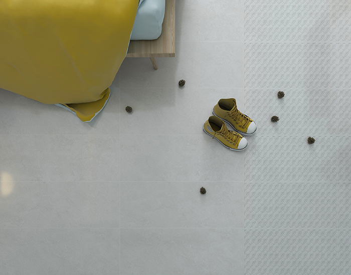 白色的表面素雅而寧靜,灰色線條橫跨其中,自然而純粹,色澤素凈大方,光感柔和自然,似乎是將一層薄薄的絲綢印刻在瓷磚的表面,縷縷輕絲纏繞,觸感舒適細膩,帶來如綢緞般絲滑體驗。