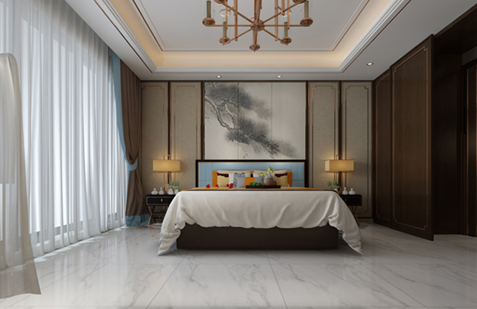 臥室家具采用實木紋,高貴大氣,設計成松子樣式的屏風完美的體現(xiàn)了不可居無松的文人理念,配合深蘊古風的燈具,更顯古典。白色系落地窗簾與地磚相得益彰,整個臥室透著一絲絲涼意。